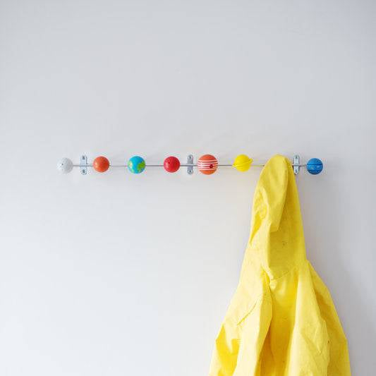 Solar System Hooks, Solid Metal Coat Rack with Colourful Wooden Planets.